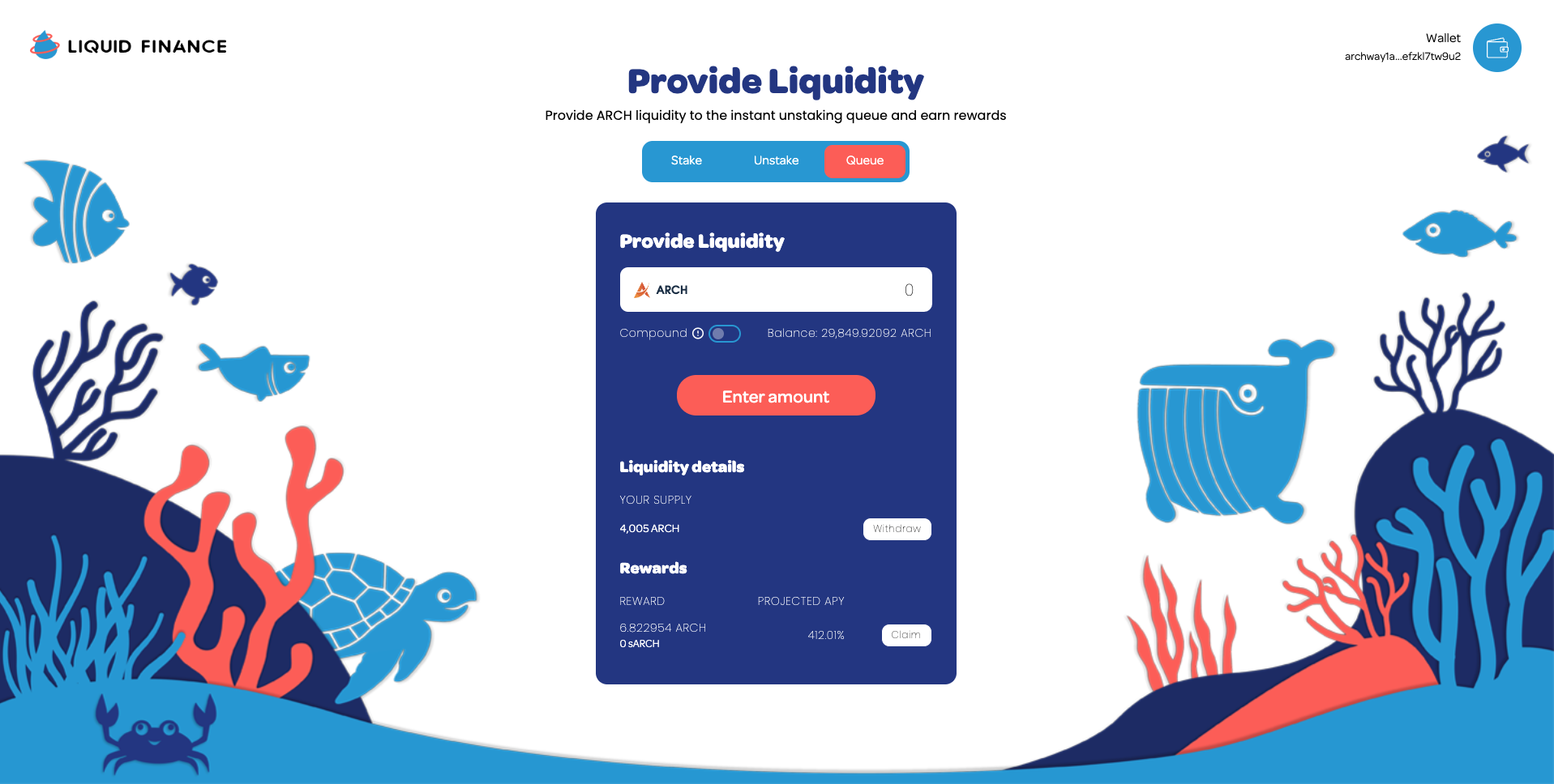 While providing liquidity to the Instant Unstaking Queue, LPs will receive ARCH token incentives provided by the Liquid Finance protocol as well as 50% of the instant unstaking fee (0.50% of the unstaked amount).