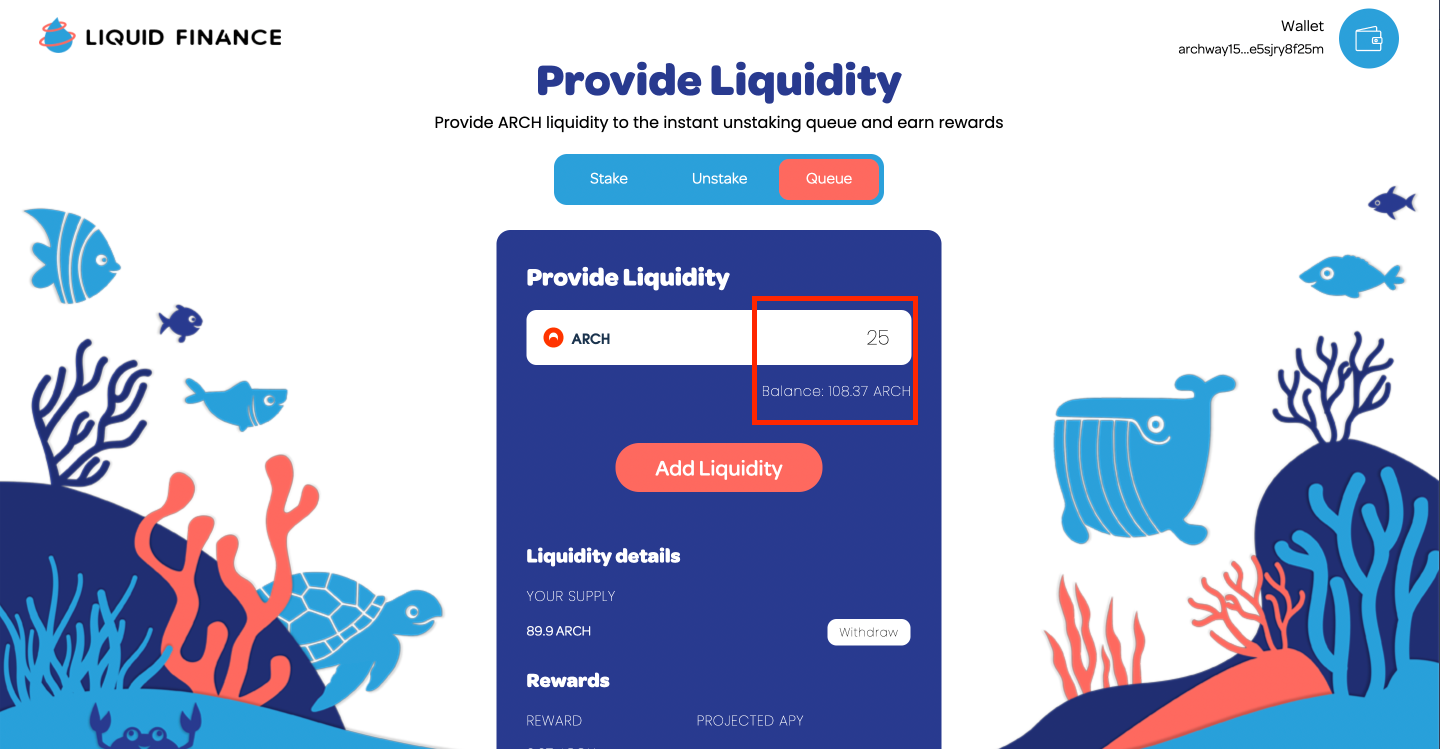 Start by inputing the amount of ARCH tokens you would like to provide as liquidity to the Instant Unstaking Queue. Please ensure that you are allowing yourself enough ARCH buffer to pay for network transaction fees